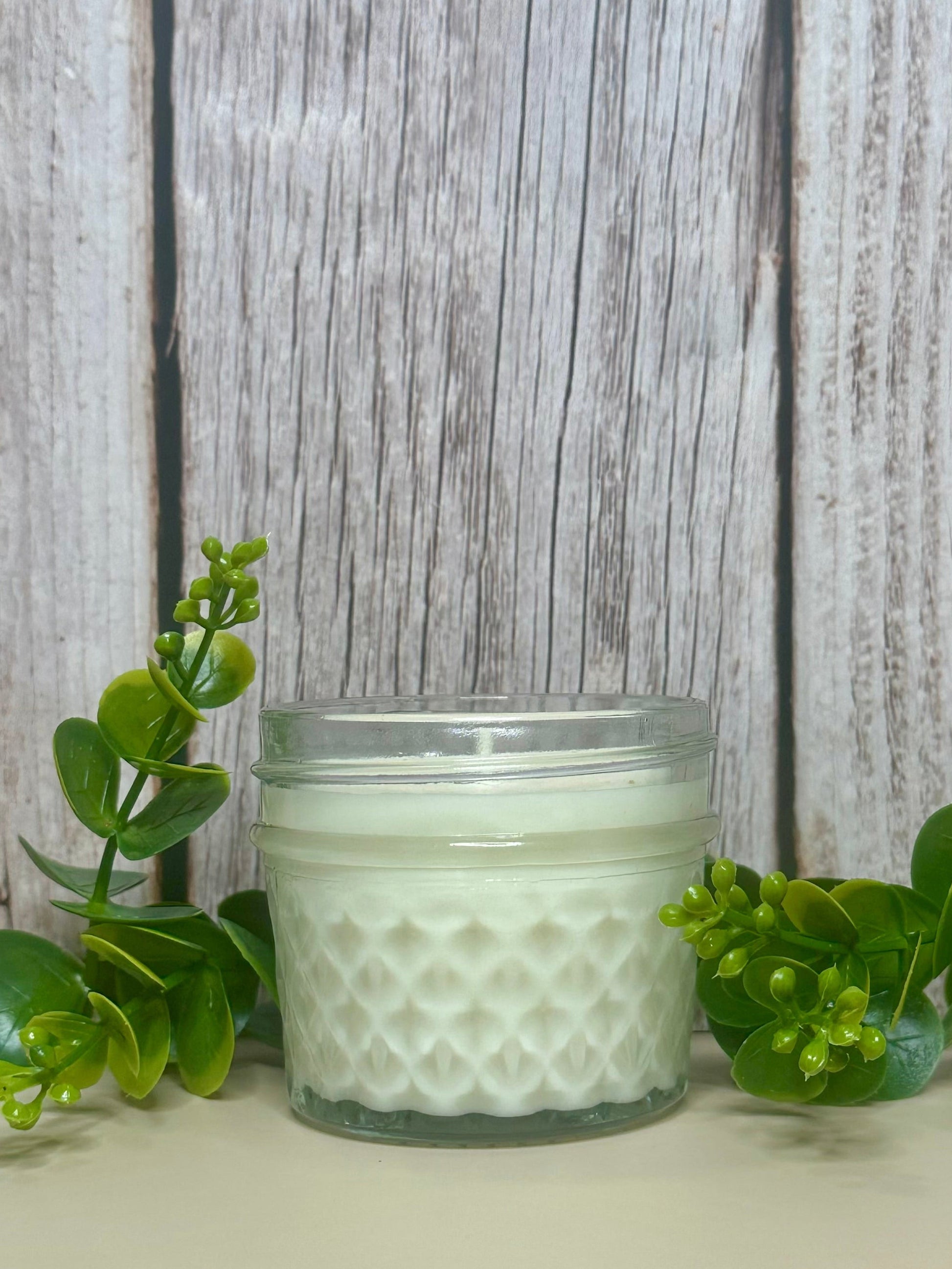 100% soy wax hand-poured in an 8 oz glass jar with a silver, screw on lid.